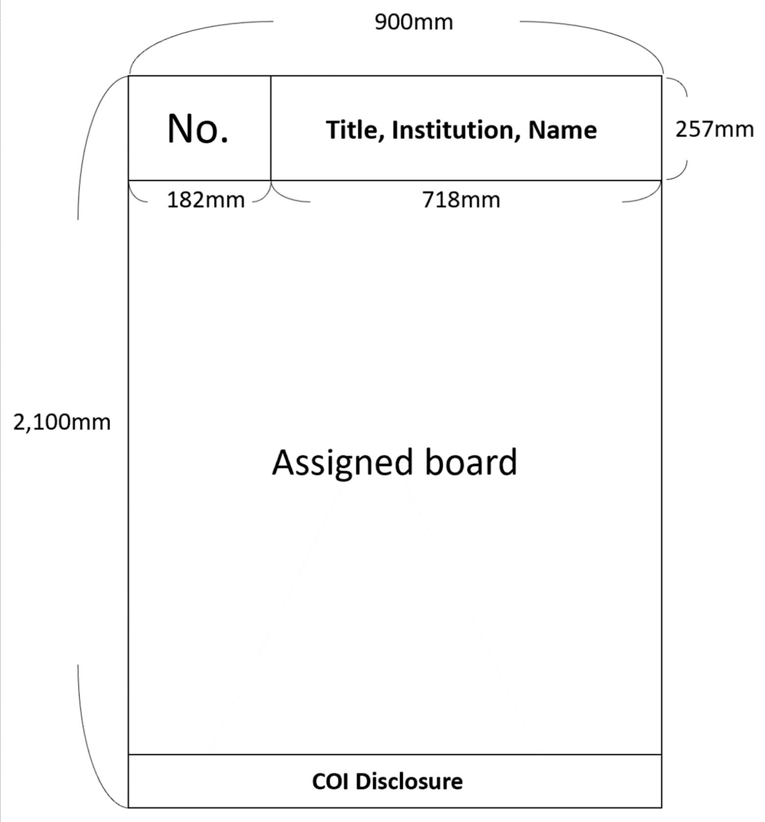 The poster session is a free-debate style. Attach the ribbon on your chest and stand in front of your poster during your presentation and discussion time. - Size of poster panel: 900mm wide X 2,100mm long. There will be a poster number display (size: 182mm wide x 257mm long) at the upper left of the panel.